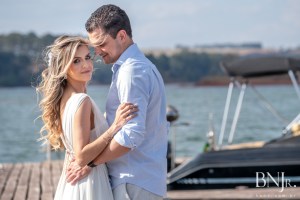 foto ao ar livre noivos a beira represa no deck de lanchas Balneário Riviera Real Camargos fotografo de casamento Beni Jr